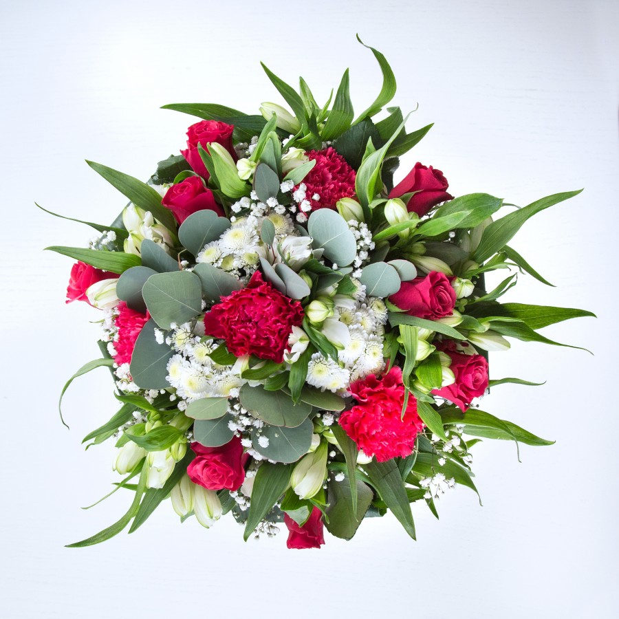 Our Radiant Floral Symphony is a masterpiece of beauty and uniqueness. Featuring a harmonious blend of red roses, white chrysanthemums, and gypsophila, this bouquet is expertly crafted to captivate and inspire.